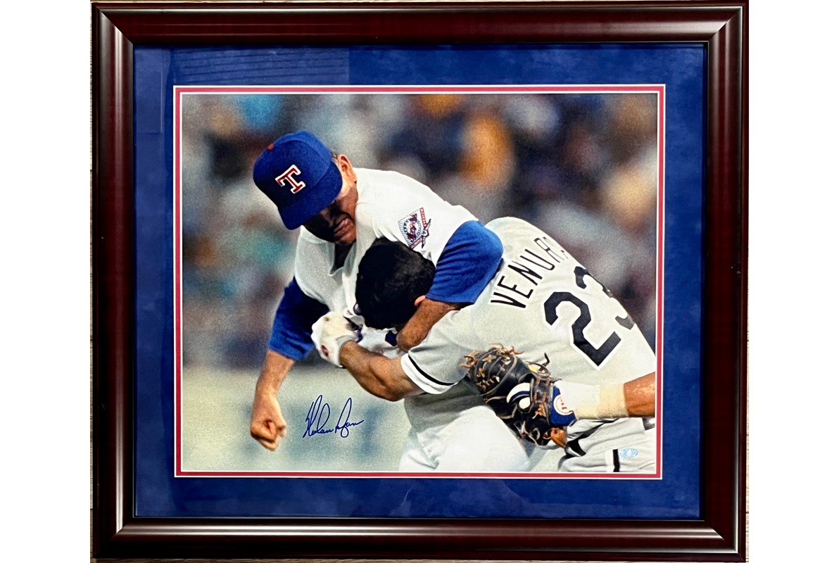 Own a piece of baseball history with a signed photo capturing Nolan Ryan's legendary fight with Robin Ventura. This autographed image immortalizes a fierce and unforgettable showdown on the diamond. Add a unique and adrenaline-pumping piece of sports history to your collection, signed by the Hall of Fame pitcher himself. INCLUDES: - Color 20" x 16" photo signed by Hall of Famer Nolan Ryan during his iconic fight with White Sox rookie Robin Ventura - Photo comes authenticated by a Nolan Ryan Hologram, AIV hologram, and COA - Professionally framed using museum quality materials including acid free matting and 99% UV glass to protect signature from fading. Dust covered backing and wired for hanging. - Framed size: 26.5" x 22.5" - FREE shipping within the continental United States Long Island Silent Auction is the tri-state area’s premier silent auction company. With over 30 years of experience in sports memorabilia and framing, Long Island Silent Auction offers only the highest quality authentic items. All items are sourced directly through the athletes or their representatives and come authenticated by leading 3rd party authenticators. All frames are museum quality. Our number 1 priority is your satisfaction. Location: Massapequa, NY Details: Nolan Ryan Fight Signed Photo, Massapequa, NY Restrictions: Winner will receive item exactly as pictured. Signature placement may vary. Book within 9 months of purchase. Valid: Valid for shipments within the continental US