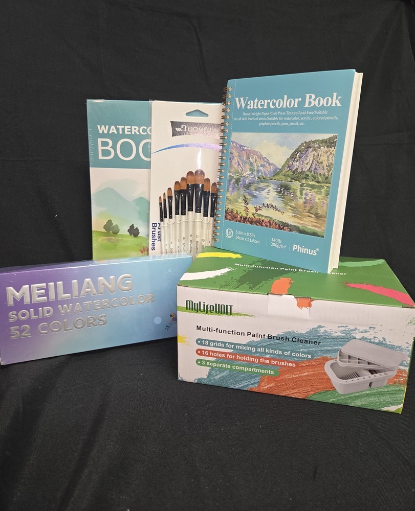 Unleash your creativity with the Watercolor Wonderland package! Perfect for beginners and seasoned artists alike, this set has everything you need to bring your ideas to life in vibrant color. Whether you’re painting delicate landscapes, bold abstracts, or playful illustrations, this bundle makes every brushstroke a joy. Items: 20 Hapikalor 9x12 Watercolor sheets 1 Hapikalor 5.5x8.5 30 page watercolor notebook 1 set of 12 brushes 1 Multi-function paint brush cleaner 1 52 color Meiliang Solid Watercolor pallet